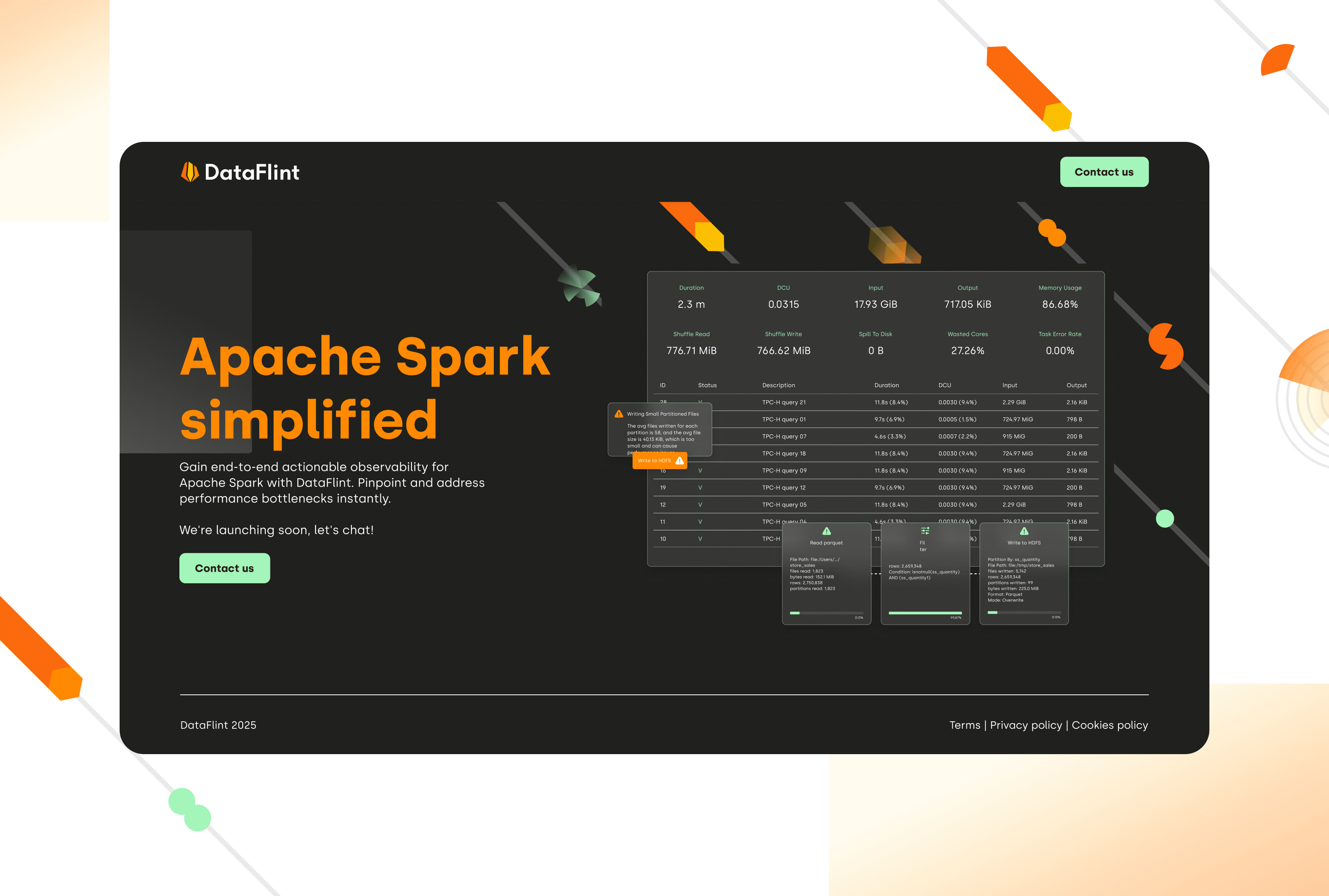 We partnered with DataFlint to create a full visual identity and design language for their trail-blazing AI-copilot for big-data teams. From logo and brand concept to marketing assets and visual system, we crafted a brand experience that feels smart, bold, and approachable. The result? A cohesive brand ecosystem—across digital and print—that elevates DataFlint’s mission to transform Apache Spark workflows into instant value.